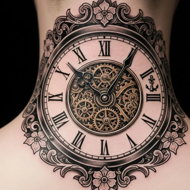 Clock face neck tattoos create powerful statements about time's passage, life's precious moments, and the importance of making every second count meaningfully. This design can feature Roman numerals, traditional numbers, or artistic interpretations that blend timekeeping with personal aesthetic preferences. The circular clock face complements your neck's curves while creating a focal point that invites closer examination and contemplation. Artists can set the time to meaningful moments like birth times, anniversaries, or significant life events that hold personal importance. Additional elements like gears, chains, or decorative frames add visual complexity and steampunk aesthetic appeal that enhances the overall design. This sophisticated choice appeals to individuals who appreciate time's philosophical implications and want constant reminders of life's fleeting nature.
