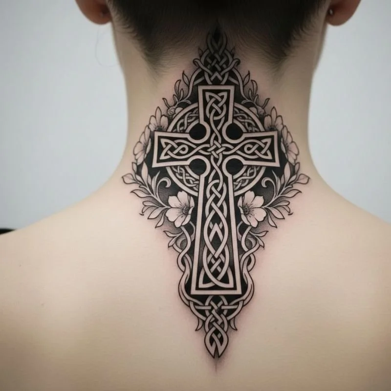 Celtic cross back neck tattoos combine spiritual symbolism with cultural heritage, creating meaningful artwork that honors both faith and ancestry. This placement centers the cross at your neck's base, where it remains visible yet respectful in most social situations. The intricate knotwork traditional to Celtic design adds visual complexity and artistic beauty that showcases incredible craftsmanship and attention to detail. These crosses represent the intersection of earthly and divine realms, making them powerful symbols for individuals seeking spiritual guidance. Artists can vary the cross size from subtle to prominent, depending on your desired level of visual impact and personal expression. This design appeals to those who want to display their faith and heritage with dignity and artistic sophistication.