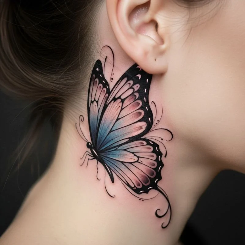 Behind-ear butterfly tattoos offer delicate beauty that peeks out subtly, creating an element of surprise and feminine charm for viewers. This placement provides intimacy since the design remains partially hidden until you move your hair or turn your head. The butterfly symbolizes transformation, rebirth, and the courage to embrace change throughout life's various phases and challenges. Artists can create realistic butterflies with detailed wing patterns or stylized versions that emphasize graceful lines and movement. Color options range from vibrant tropical hues to elegant black and gray that maintains sophistication and timeless appeal. This design works exceptionally well for individuals wanting meaningful symbolism without overwhelming visual impact that dominates their entire appearance.