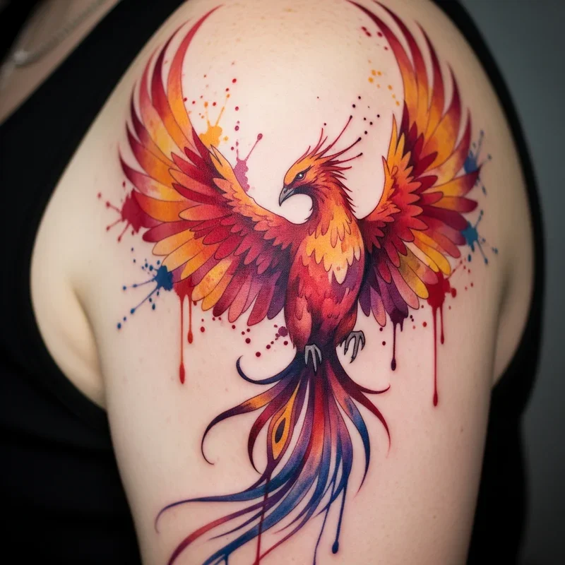 Imagine paint splashing across your skin in brilliant bursts of color, forming a phoenix that looks like it flew straight out of an artist's canvas. Watercolor phoenix tattoos break all the rules with their soft edges, color bleeds, and dreamy aesthetic that feels both delicate and powerful. The technique mimics actual watercolor paintings with translucent layers that seem to flow and merge naturally. Blues, purples, and pinks create a mystical aura, while traditional fire colors maintain the phoenix's essence. This style particularly appeals to creative souls who see their transformation as an artistic journey rather than a battle. The absence of harsh black outlines makes the design appear to emerge from within your skin. Splatter effects and paint drips add spontaneity, suggesting that your rebirth is an ongoing, organic process. Artists skilled in this technique understand how colors interact on skin, creating pieces that look freshly painted.