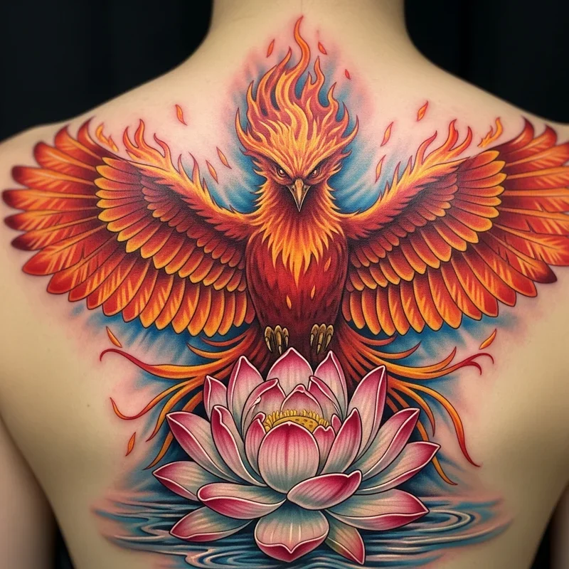 Merge Eastern and Western symbolism by depicting your phoenix emerging from a lotus flower, combining two powerful symbols of transformation and enlightenment. The lotus, growing from mud to bloom above water, parallels the phoenix's rise from ashes, creating doubled meaning about beauty from struggle. This design often features the lotus at the base with the phoenix appearing to be born from its petals, suggesting that spiritual awakening and rebirth are interconnected. Soft pink lotus petals contrast beautifully with fiery phoenix colors, creating visual harmony. The composition works vertically, making it perfect for spine, thigh, or calf placement. Buddhist and Hindu elements can be incorporated, adding spiritual depth to the design. Water ripples or muddy roots might be included to show the full journey from darkness to light. This combination appeals to those whose transformation included spiritual awakening or meditation practice.