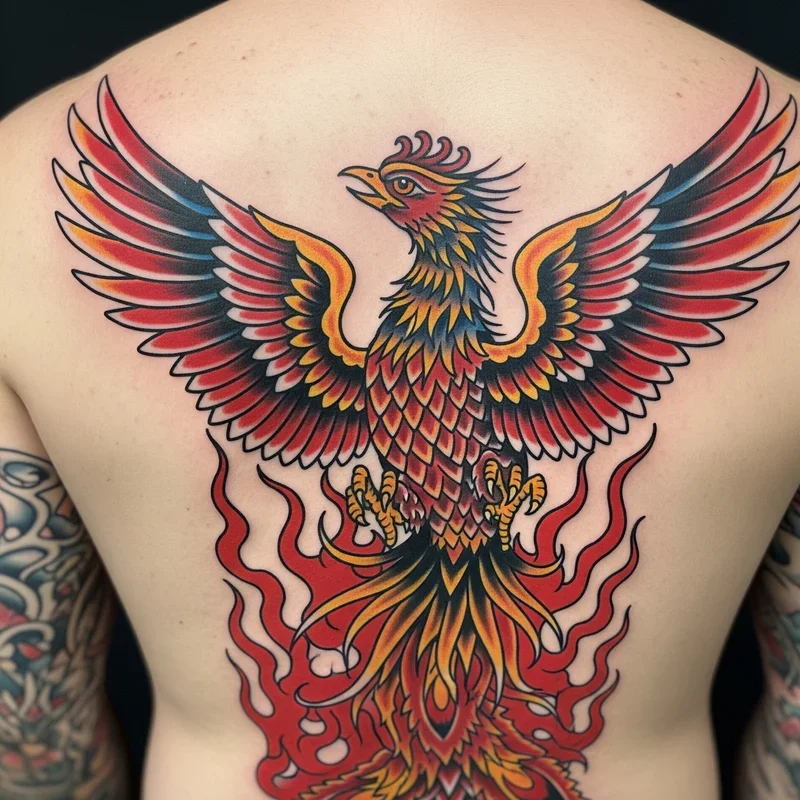 Go big or go home with a full back piece where your phoenix spreads its wings from shoulder to shoulder, creating a breathtaking display of artistry and symbolism. This placement offers the largest canvas for intricate details, allowing every feather, flame, and design element to be fully realized. The spine often serves as the phoenix's body, with wings extending across shoulder blades in perfect symmetry. This design makes a powerful statement about carrying your transformation story on your back, literally supporting you through life. Full color creates stunning visual impact, though black and gray offers timeless elegance. The size allows for incredible detail work, from individual feather barbs to complex background elements. Many people choose to build this piece over time, starting with the central phoenix and adding elements that represent different life chapters. This placement symbolizes protection, as if the phoenix watches your back.