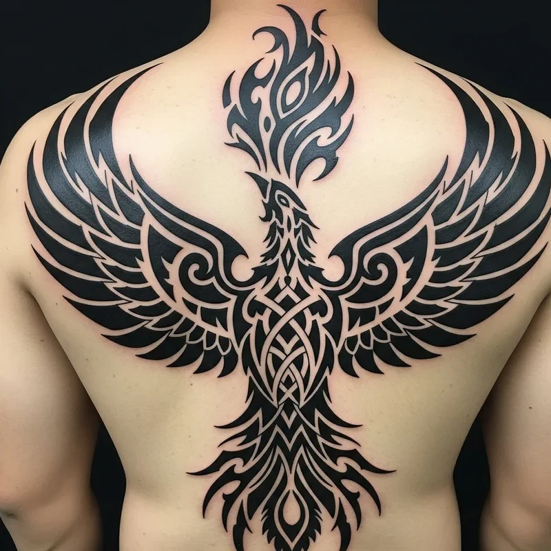 Rooted in ancient traditions, tribal phoenix tattoos use bold black patterns and negative space to create striking designs that command attention. The style draws from Polynesian, Native American, or Celtic tribal art, each bringing unique pattern meanings and cultural significance. Thick black lines form the phoenix's body through interlocking patterns that flow naturally with your body's movement. The absence of color doesn't diminish impact; instead, it creates timeless artwork that never goes out of style. Tribal designs often incorporate protection symbols, strength patterns, or family heritage elements within the phoenix form. The solid black ink ages beautifully, maintaining sharp contrast over decades. These tattoos work particularly well on shoulders, upper arms, or across the chest where the patterns can flow with muscle definition. The primal nature of tribal design connects your personal rebirth to ancestral strength and collective human resilience.