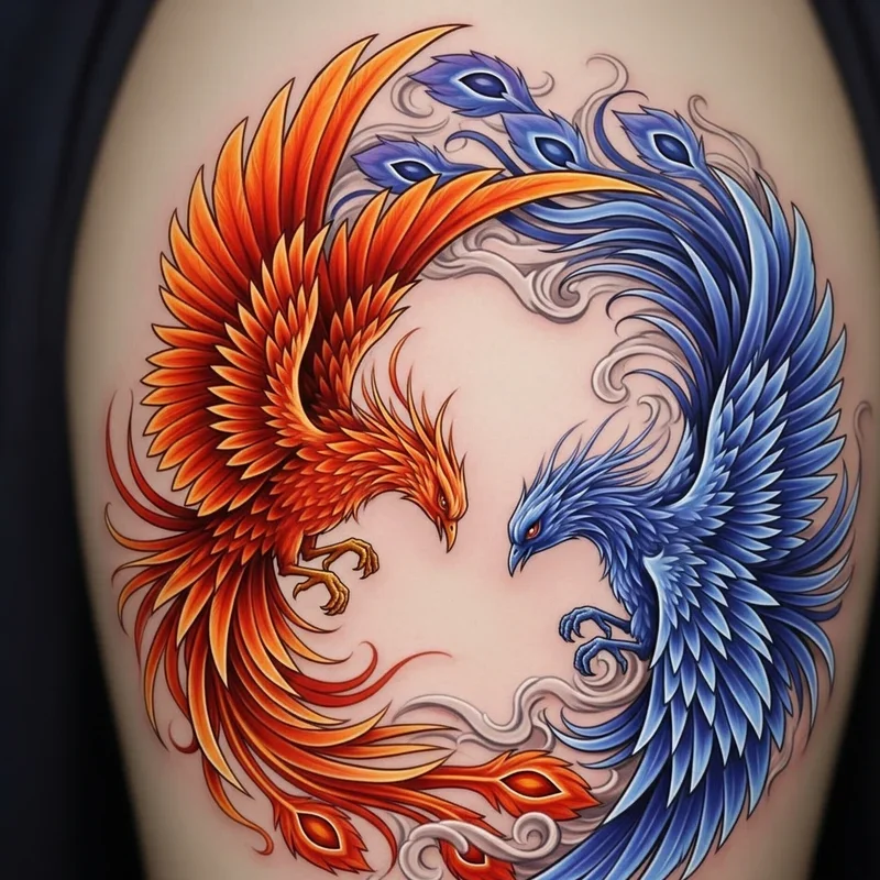 Two phoenixes intertwined or mirroring each other represent the duality within transformation: destruction and creation, darkness and light, who you were and who you've become. This design acknowledges that rebirth isn't simple or singular but involves multiple aspects of self. The phoenixes might be identical but in different colors, representing same soul in different states. Or they could be opposites: one rising while one falls, showing life's continuous cycle. Some designs feature phoenixes facing each other, creating heart shapes with their necks or forming circular compositions with their bodies. This concept works beautifully for couples who've transformed together or for representing internal balance between conflicting aspects of personality. The design can be symmetrical for harmony or asymmetrical for dynamic tension. Colors often contrast or complement, creating visual dialogue between the two birds. This sophisticated approach appeals to those who understand transformation's complexity.
