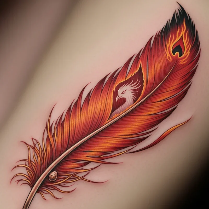 A single phoenix feather holds the entire story of resurrection within its delicate barbs and shaft, making it a perfect choice for those who prefer symbolic over literal representations. These tattoos focus on one magnificent feather that contains hidden elements like tiny flames, faces, or even miniature phoenixes within the feather's structure. The detail work requires exceptional artistic skill, creating a piece that reveals new elements every time someone looks closely. Colors can range from traditional fire hues to unexpected choices like deep purples or electric blues. The feather's natural curve works beautifully along the body's contours, especially on ribs, spine, or behind the ear. Some designs show the feather transforming into birds or smoke at the tip, representing ongoing transformation. This subtle approach appeals to professionals who need easily concealable tattoos or anyone who prefers their symbolism more cryptic than obvious.