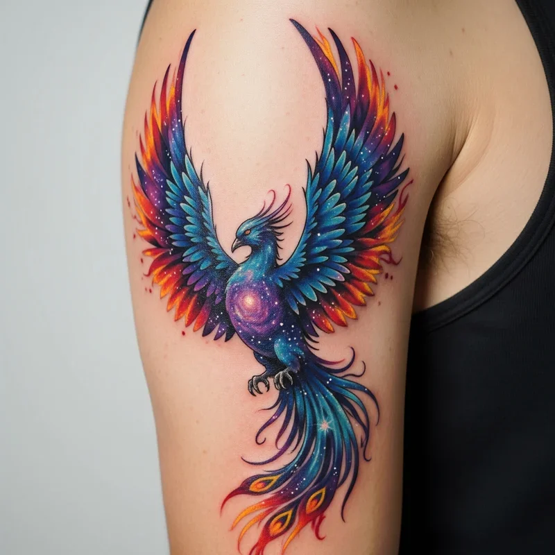 Blast off into space where your phoenix soars through nebulas, its feathers containing entire galaxies and constellation patterns. This cosmic interpretation transforms the traditional firebird into a creature of stardust and universal energy, suggesting rebirth on a cosmic scale. Deep purples, electric blues, and pink nebula clouds replace traditional flames, while stars sparkle throughout the design. The phoenix becomes one with the universe, representing how your transformation connects to something greater than yourself. White ink highlights create stars and distant galaxies within the feathers. This style particularly resonates with those who see their journey as spiritual awakening or consciousness expansion. The design often incorporates actual constellation patterns, zodiac symbols, or planetary elements. Watercolor techniques blend perfectly with this concept, creating ethereal effects that make your phoenix appear to be made of space itself.