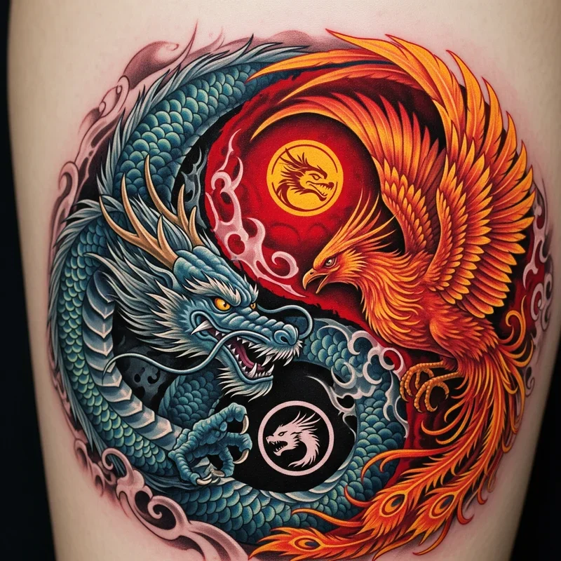Combine two legendary creatures in an eternal dance where phoenix represents feminine energy, rebirth, and grace while the dragon embodies masculine power, wisdom, and strength. This design creates perfect balance, showing that transformation requires both fierce determination and gentle acceptance. The creatures often intertwine in a circular composition reminiscent of the yin-yang symbol, with the phoenix's flames complementing the dragon's water or earth elements. Colors typically contrast, with the phoenix in warm tones and the dragon in cool hues, though black and gray versions create dramatic effect. This tattoo speaks to those who've found balance through their struggles, understanding that destruction and creation are two sides of the same coin. The design can be adapted to various sizes, from small wrist pieces to full back masterpieces. Cultural elements from both Eastern and Western traditions can be incorporated.