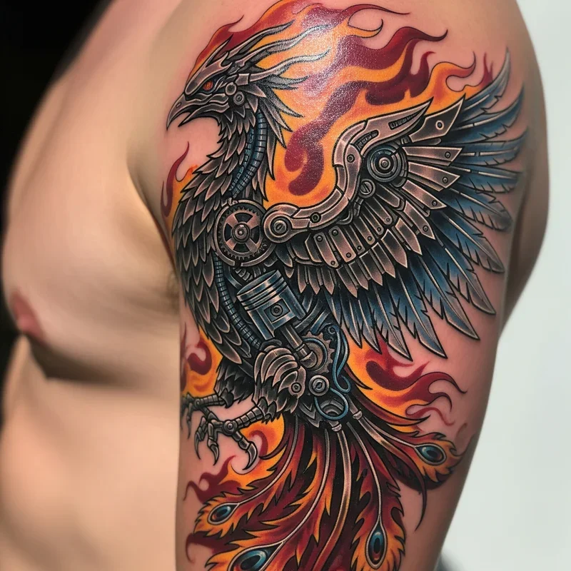 Imagine your phoenix as part machine, part mythical creature, where feathers become metal plates and flames transform into electrical currents. Biomechanical phoenix tattoos appeal to sci-fi enthusiasts and those who see their transformation as rebuilding themselves piece by piece. Gears, pistons, and circuitry integrate with organic elements, creating a cyborg firebird that represents technological evolution alongside spiritual rebirth. The style requires exceptional shading skills to create the illusion of metal and machinery beneath torn skin effects. Chrome and copper tones replace traditional colors, though flame effects might still appear as energy emissions. This design speaks to those who've had medical interventions, physical rebuilding, or see their transformation as systematic reconstruction. The mechanical elements can be incredibly detailed, with visible screws, hydraulics, and wire networks. This futuristic interpretation suggests that rebirth isn't just natural but can be engineered and controlled.