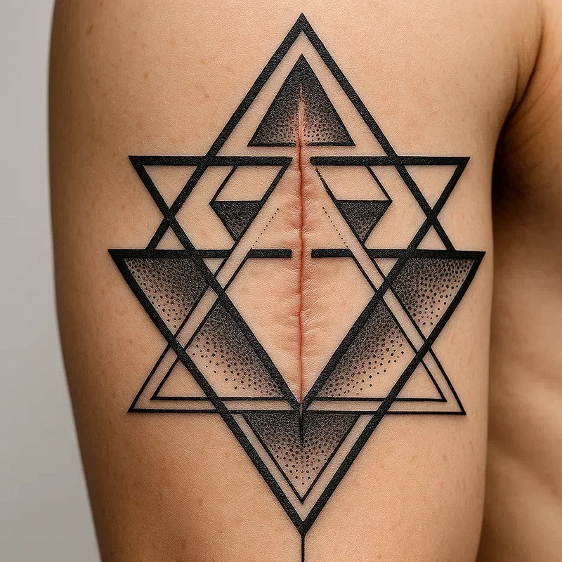 Sometimes scars create sharp angles and straight lines that seem impossible to disguise, but geometric tattoos flip this challenge into an opportunity. Sacred geometry, dotwork patterns, and angular designs actually benefit from incorporating existing lines and textures, making your scars part of the mathematical beauty. Think of it as architectural art where your scar becomes a foundational element in a larger structural design. Triangles, hexagons, and intricate line work can transform surgical scars into intentional-looking design elements that appear planned from the start. The precision of geometric tattoos creates a sense of order and intention that reframes your scar from accidental to artistic. Modern techniques like dotwork and fine line styles add depth without overwhelming the area. This style particularly suits those who appreciate contemporary aesthetics and want their body art to feel purposeful.