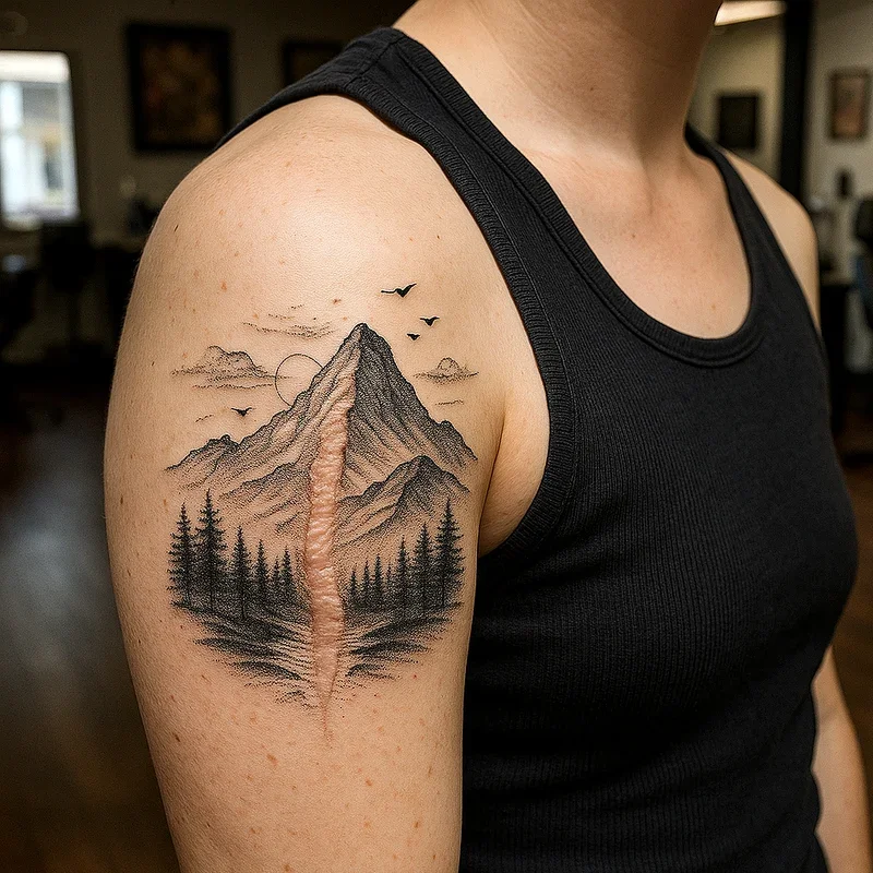 Why not let your scars become mountains, rivers, or tree bark in a larger landscape? Nature scene tattoos excel at incorporating existing skin textures into realistic environmental elements where roughness and irregularity actually enhance authenticity. Your raised scar tissue might become a mountain ridge, while indented scars transform into valleys or riverbeds in your personal topographical map. Forest scenes work brilliantly, with scars becoming paths through woods or the textured bark of ancient trees. Wildlife can be added to bring movement and life to the scene. This approach celebrates rather than conceals, making your scars active participants in the artwork rather than obstacles to overcome. Artists skilled in realism can create depth and dimension that turns your skin into a three-dimensional canvas where scars add genuine texture to the natural masterpiece.