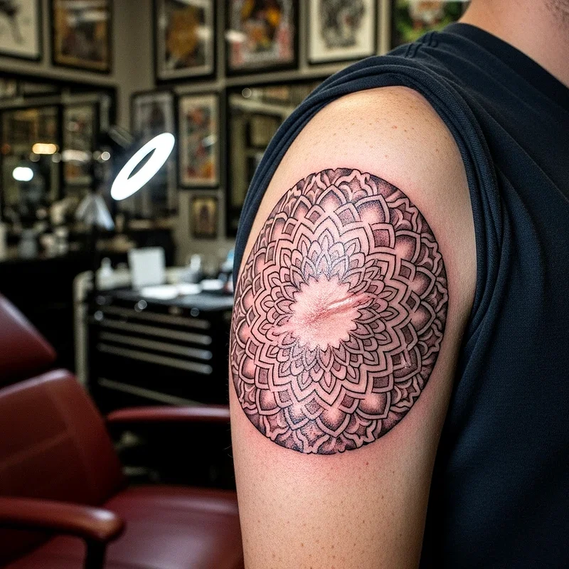 Circular scars from surgeries or injuries find their perfect match in mandala designs, where symmetry and repetition create mesmerizing patterns that naturally draw the eye into their center. These spiritual symbols represent wholeness and unity, making them deeply meaningful choices for those seeking to integrate their scars into a design about completeness rather than damage. The concentric circles and intricate patterns of mandalas can expand outward from a central scar, making it the focal point of something beautiful rather than something to hide. Your artist can adjust line weights and pattern density to accommodate varying scar textures, creating visual balance throughout the design. Traditional elements like lotus petals or geometric shapes add layers of meaning. The meditative quality of mandalas reflects the healing journey, turning your scar into a permanent reminder of balance and growth.