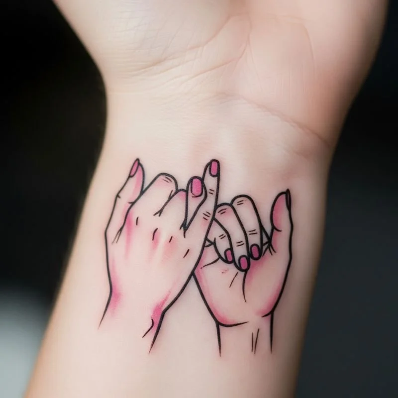 Pinky promise tattoos immortalize sacred childhood oaths, representing the first agreements sisters make together. These intimate gestures symbolize trust, commitment, and shared secrets from promising to keep crushes secret to always having each other's backs. Usually executed in fine line style, this design combines nostalgic appeal with contemporary aesthetics. Clean, minimal lines create modern interpretations while subtle details like small hearts, stars, or meaningful words add personalization. Sisters can choose matching tattoos or complementary pieces where each gets one hand, creating a complete image when together. The design honors childhood memories while making sophisticated adult statements about enduring promises.