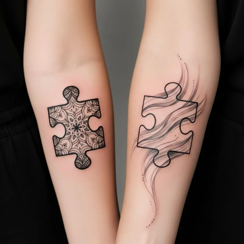 Puzzle piece tattoos literally represent "you complete me," capturing how sisters fit together perfectly despite individual uniqueness. This design works on multiple levels: visually recognizable, emotionally meaningful, and philosophically representing harmony through differences. Customization options are endless, from traditional jigsaw shapes to custom interlocking designs. Sisters can choose obviously connecting pieces or pieces from different puzzle parts, suggesting connection even when apart. Color choices add meaning layers, with matching colors suggesting harmony and complementary colors emphasizing strength through differences. Enhancement details can include meaningful symbols, dates, or parts of larger images that only make sense when both pieces are viewed together.