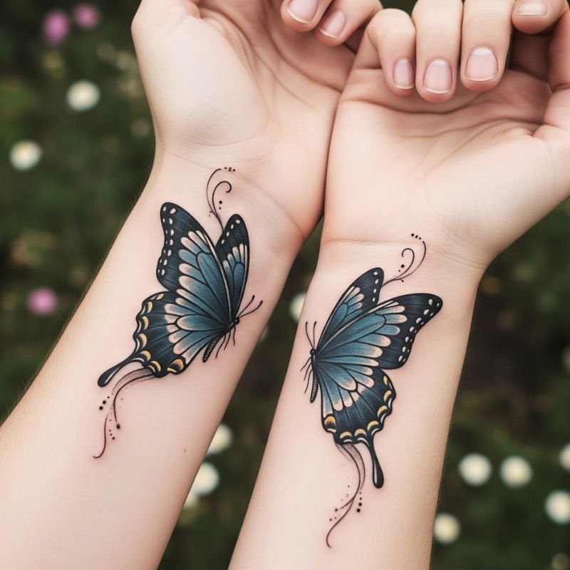 Butterflies symbolize transformation and growth, representing how sister bonds evolve through different life stages from childhood dynamics to adult friendships built on choice. The metamorphosis mirrors how relationships transform as you watch each other grow and change while supporting each other through transitions. Design versatility offers multiple meanings: identical butterflies representing synchronized growth, complementary butterflies showing different development while maintaining connection, or two halves of one butterfly symbolizing incompleteness without each other. Color choices add emotional depth, from monochromatic elegance to bright celebrations of relationship joy. Enhancement elements like floral accents or meaningful dates create personalized designs. Placement enhances symbolic meaning, with shoulder blades suggesting giving each other wings to fly.