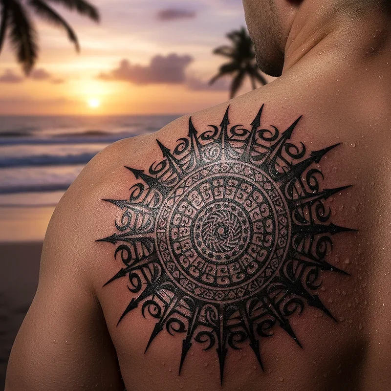 Tribal sun designs merge ancient cultural artistry with modern tattoo techniques, creating bold statements that honor indigenous traditions worldwide. These tattoos feature thick black lines, sharp angles, and intricate patterns that spiral outward from a central core, embodying strength and spiritual connection. Polynesian, Native American, and African tribal styles each offer unique interpretations, allowing you to choose designs that resonate with your heritage or aesthetic preferences. The symmetrical patterns create mesmerizing visual effects that draw the eye and spark conversation. Typically larger pieces, tribal suns work beautifully on the shoulder, upper arm, or back, where the design has room to breathe and showcase its intricate details. Consider researching specific cultural meanings to ensure your chosen design respects and accurately represents its origins.