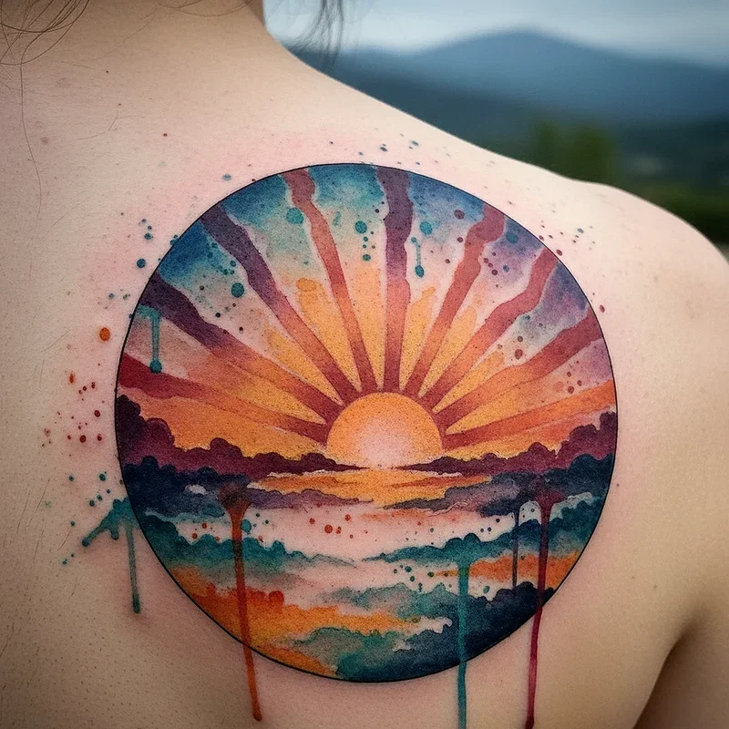 Imagine capturing the breathtaking beauty of dawn permanently on your skin through vibrant watercolor techniques that blur the lines between tattoo and fine art. This style mimics paint bleeding and blending on canvas, creating soft edges and brilliant color transitions from deep purples and blues to warm oranges and yellows. The sun emerges through these color washes like a dream, sometimes with defined edges, sometimes dissolving into the surrounding hues. Artists skilled in watercolor tattoos can create effects that look spontaneous and fluid, though the technique requires careful planning and execution. These pieces work beautifully on larger areas like the thigh, ribcage, or back, where the colors have space to flow and blend naturally, creating a wearable sunrise.