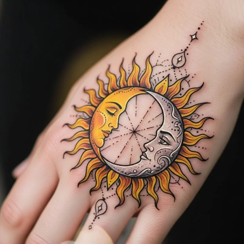 Day and night, light and dark, masculine and feminine? Sun and moon tattoos celebrate life's essential dualities. These celestial bodies represent balance in all forms: work and rest, logic and intuition, strength and gentleness. Design styles range from realistic to mystical, separate to intertwined. Some people show phases representing life cycles or add faces for personality. Mandala-style versions bring spiritual depth, while minimalist approaches keep things simple. Your sun and moon acknowledge that wholeness requires embracing opposites, that you contain multitudes. It's ideal for anyone who's learned to dance between extremes rather than choosing sides.