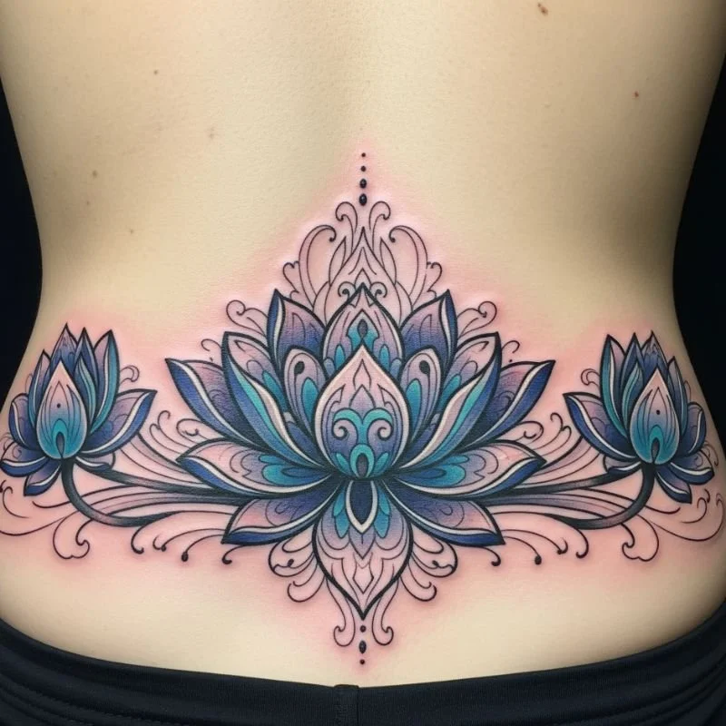 Lotus flowers bloom from muddy waters to become symbols of purity, enlightenment, and rebirth, making them perfect for meaningful lower back tattoos. These designs can be as simple as a single bloom or as complex as entire pond scenes. Traditional approaches show the lotus from above, displaying its perfect symmetry, while side views capture the elegant stem and leaves. Incorporate mandala patterns within the petals for added intricacy, or surround your lotus with water ripples and koi fish for a complete scene. Color choices carry meaning too: pink for spirituality, blue for wisdom, white for purity. Many people add Sanskrit symbols, om signs, or meaningful quotes to enhance the spiritual aspect. The lower back's width allows for creative compositions, from minimalist line art to fully rendered botanical illustrations that celebrate this sacred flower.