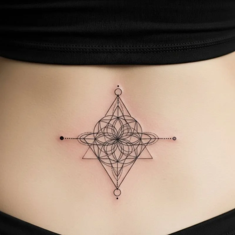 Sacred geometry transforms your lower back into a mesmerizing display of mathematical precision and spiritual symbolism. Think interconnected triangles forming complex patterns, hexagons creating honeycomb effects, or circles within circles representing infinity. These designs speak to those who find beauty in symmetry and meaning in ancient symbols. The Flower of Life, Metatron's Cube, or Sri Yantra patterns create stunning focal points that draw the eye and spark conversation. What makes geometric tattoos particularly striking on the lower back? The flat surface allows for perfect symmetry, making every angle and line appear intentional and precise. Add dot work shading for dimension or keep it clean with bold lines for a more modern aesthetic. These tattoos work brilliantly as standalone pieces or as frameworks for incorporating other elements like florals or celestial bodies.