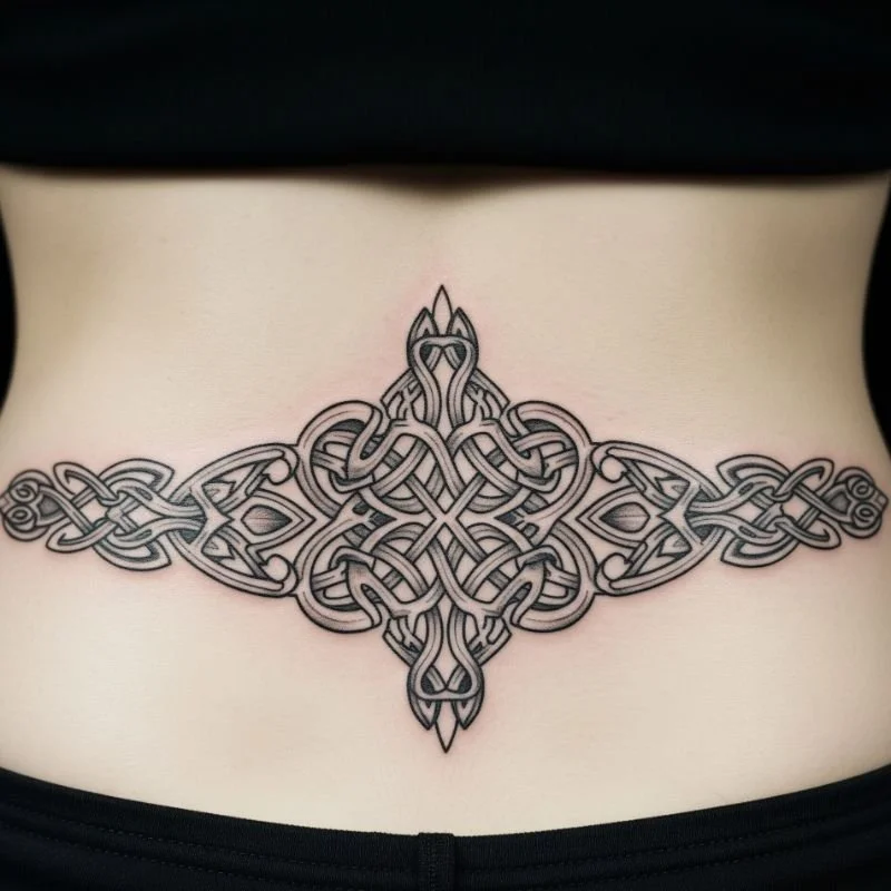 Celtic knots bring ancient symbolism and intricate artistry to lower back tattoos, creating designs that are both meaningful and visually stunning. These endless loops represent eternity, loyalty, and the interconnectedness of life. Traditional patterns include the Trinity knot, Celtic cross elements, or the lover's knot for those celebrating relationships. Modern interpretations might incorporate these knots into larger designs, weaving them through floral elements or combining them with other cultural symbols. The mathematical precision required for Celtic knots makes them particularly striking when done well, with each line flowing seamlessly into the next. Black ink creates bold, graphic impact, while subtle shading adds dimension to the overlapping elements. These designs can be scaled to any size, from delicate central pieces to elaborate patterns that span the entire lower back.