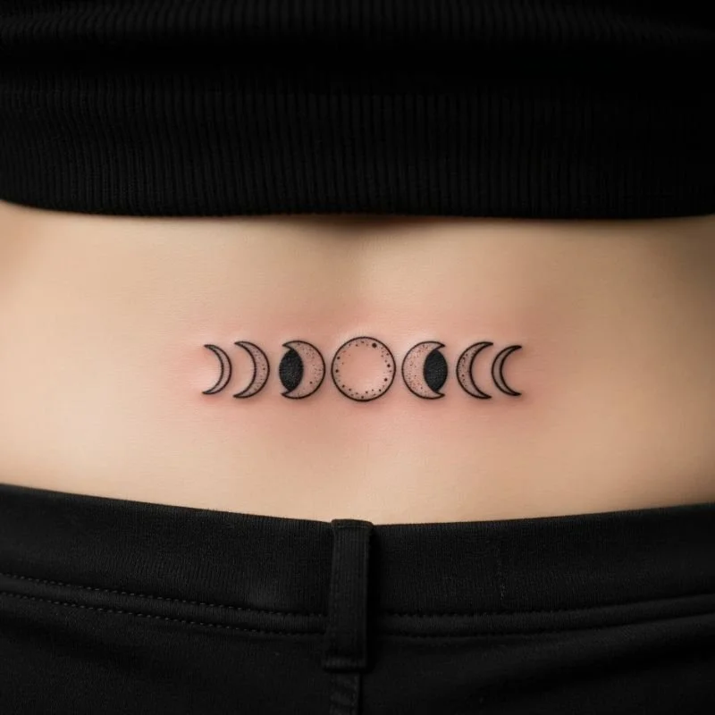 For the cosmic souls and night sky admirers, moon phase tattoos offer a perfect blend of simplicity and significance. Picture five to seven moons in various stages lined horizontally across your lower back, each phase telling part of your story. This design celebrates cycles, transformation, and the feminine divine. Keep it simple with basic outlines or add details like craters and shading for depth. Some people incorporate birthdates by highlighting specific moon phases from meaningful days. Others add tiny stars, constellation patterns, or even small quotes about growth and change. The linear nature of this design works perfectly with the lower back's natural shape. You can scale it to be bold and prominent or delicate and whisper-soft. Either way, moon phases remind us that change is beautiful and every phase has its purpose.